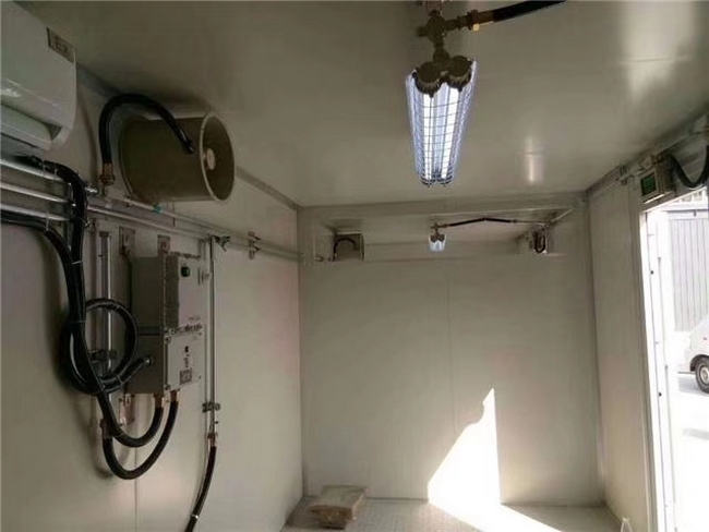 防爆集裝箱設(shè)有防爆配電箱1臺(tái),內(nèi)部元器件采用正泰品牌,.滿足內(nèi)部照明、風(fēng)機(jī)、報(bào)警等元器件供電,內(nèi)部配有LED防爆防腐全塑熒光燈2只,防爆照明開(kāi)關(guān)2只,獨(dú)立控制照明,防爆應(yīng)急標(biāo)志一體燈1只。